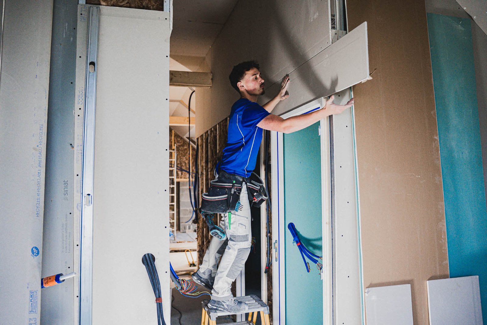 Pose de cloisons en plaques de plâtre (BA13), bandes et joints pour des murs prêts à recevoir les finitions.